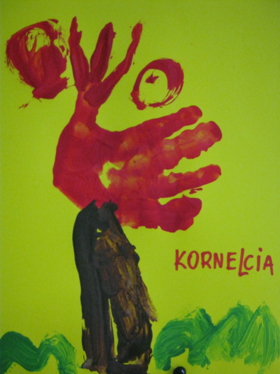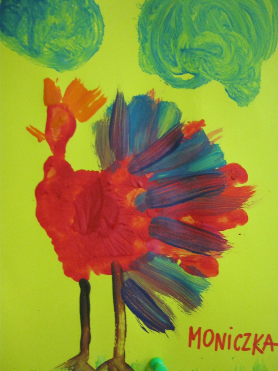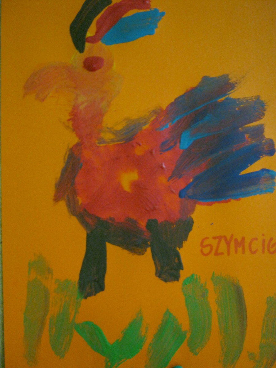 Przedszkole Alutka - dzieci z grupy Żabek namalowały obrazki pod tytułem "Palczasty-jesienny kogucik".